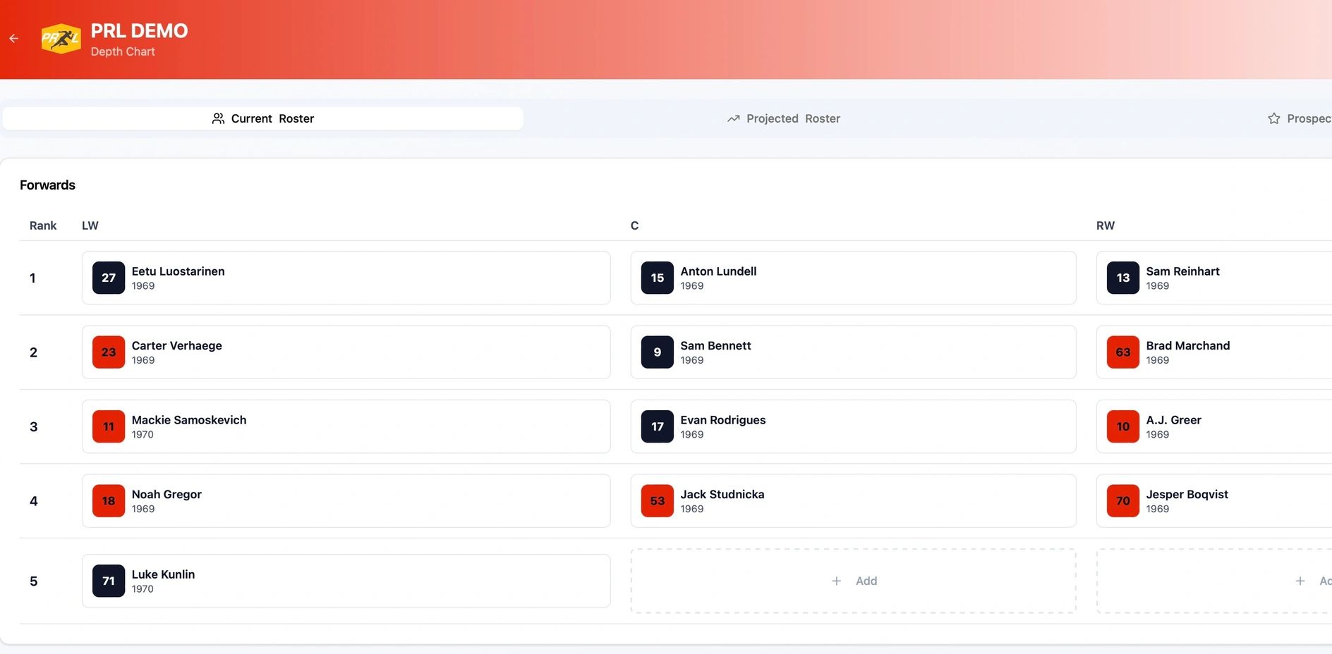 PRL Team Builder is our newest platform designed to give coaches, front offices, and scouting departments a complete, long‑view picture of their team. From today’s depth chart to tomorrow’s lineup, it centralizes everything you need to evaluate talent and plan your roster with confidence.
